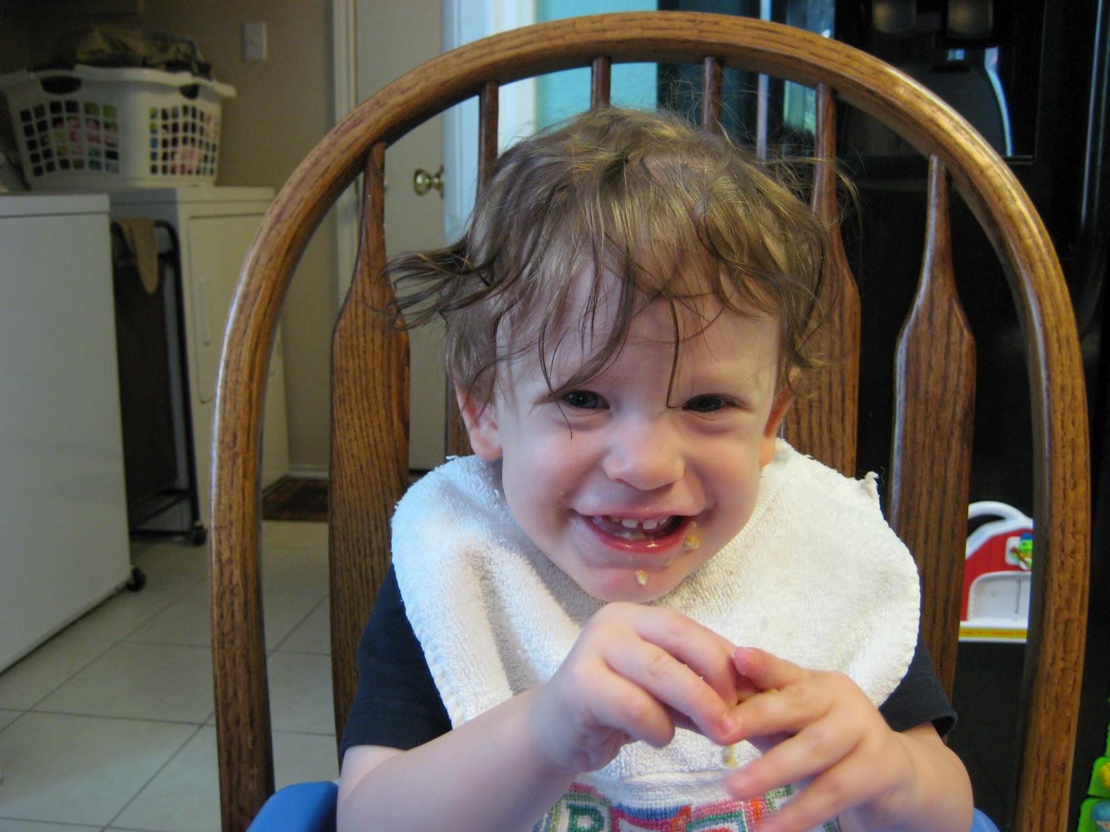 That worked for half of his head. Then he started grabbing for the scissors, flailing and arching his back, and generally protesting in every possible way. I was really hoping to get it all done at once so we only had one mess to clean up, but we called it "part one" success.